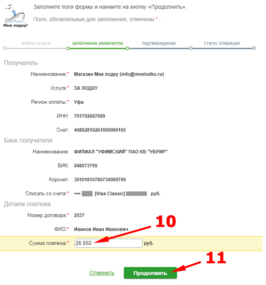10. Вводите сумму к оплате (сумма Вашего заказа).