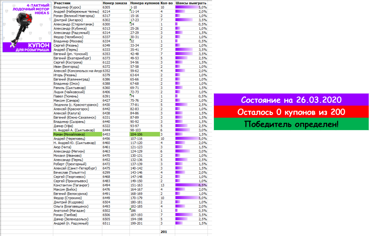 Розыгрыш состоится, когда количество выданных купонов достигнет 200 шт. Купон победителя выберем случайно с помощью сервиса randstuff.ru. Информацию с номерами заказов и купонов будем обновлять здесь.