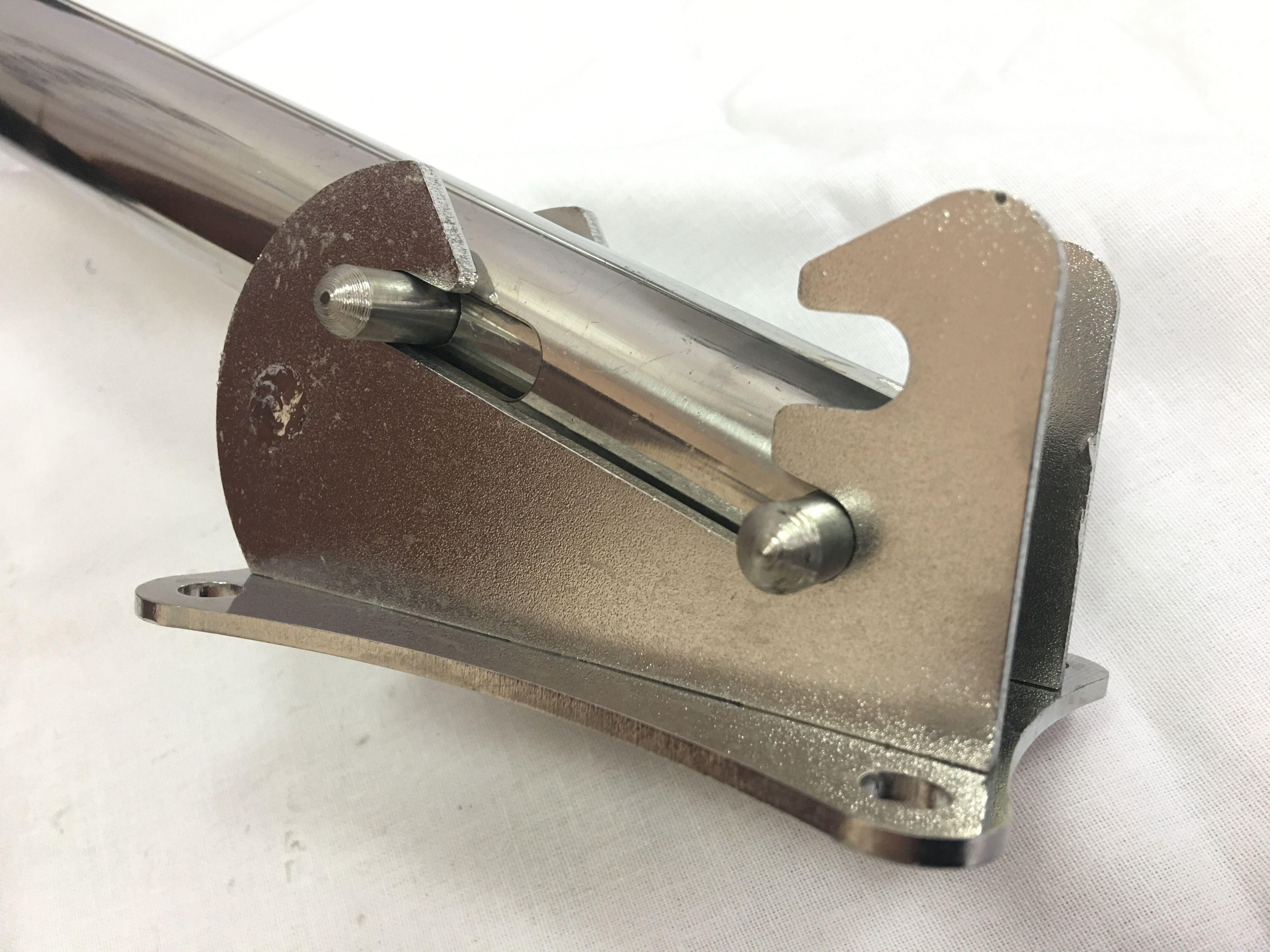 Колёса транцевые быстросъемные для НДНД, выполнены из бесшовной трубы 32*2 мм. Модель имеет рабочее положение с подпружиненным механизмом, который позволяет быстро отстегнуть кронштейн колеса от фланца. В нижнем положении колеса имеют угол наклона для того, чтобы обойти подушку надувного дна, а также интерцептор. Вверх колеса также можно устоановить, для этого на фланце предусмотрена вторая направляющая.