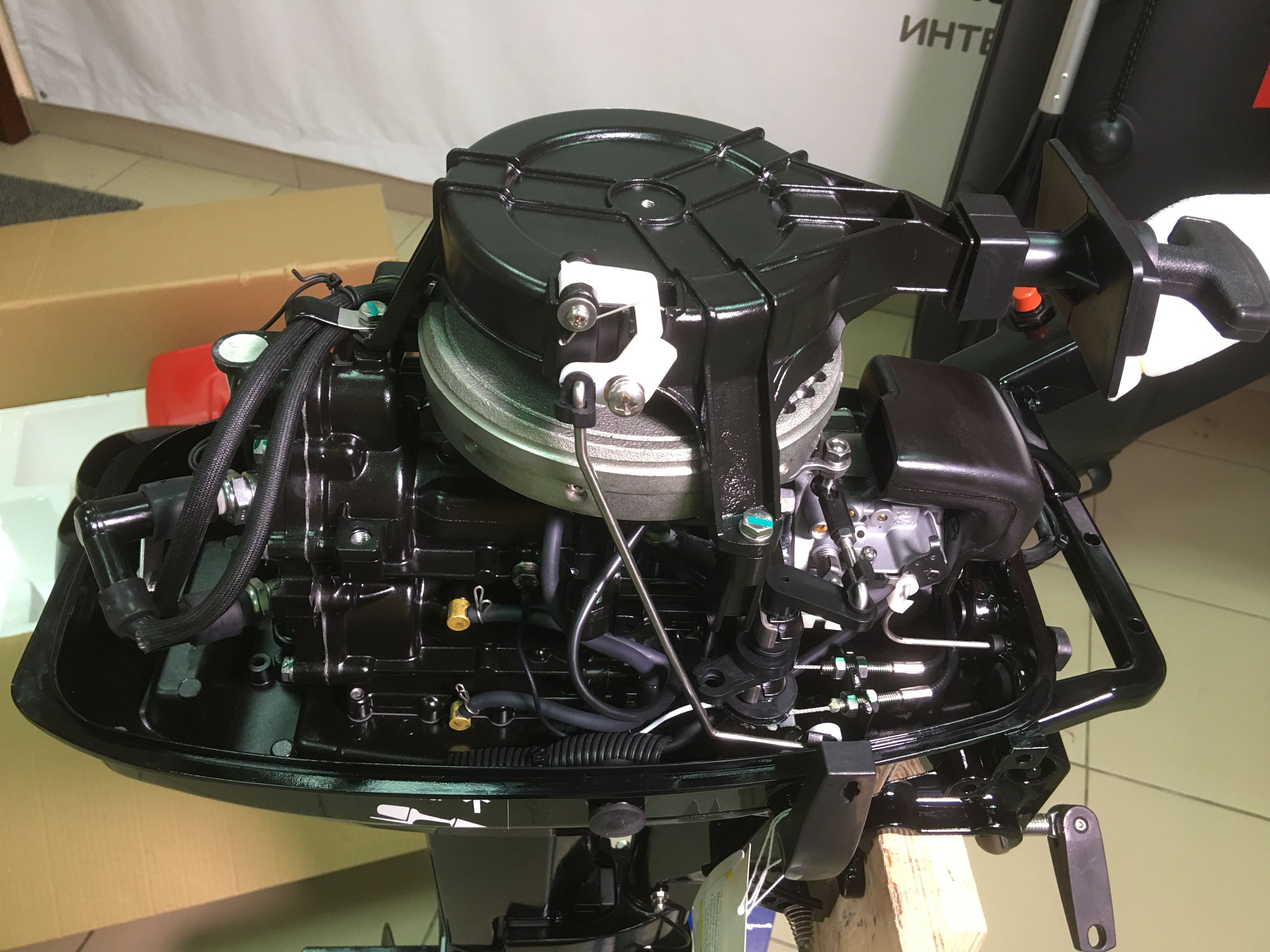 Двухтактный лодочный мотор MARLIN 9.8. Является копией мотора TOHATSU 9.8. Это 9.8 сильный никак не задушенный мотор. На шильдике и наклейке указано 9.8 л.с. По документам 9.8 л.с.