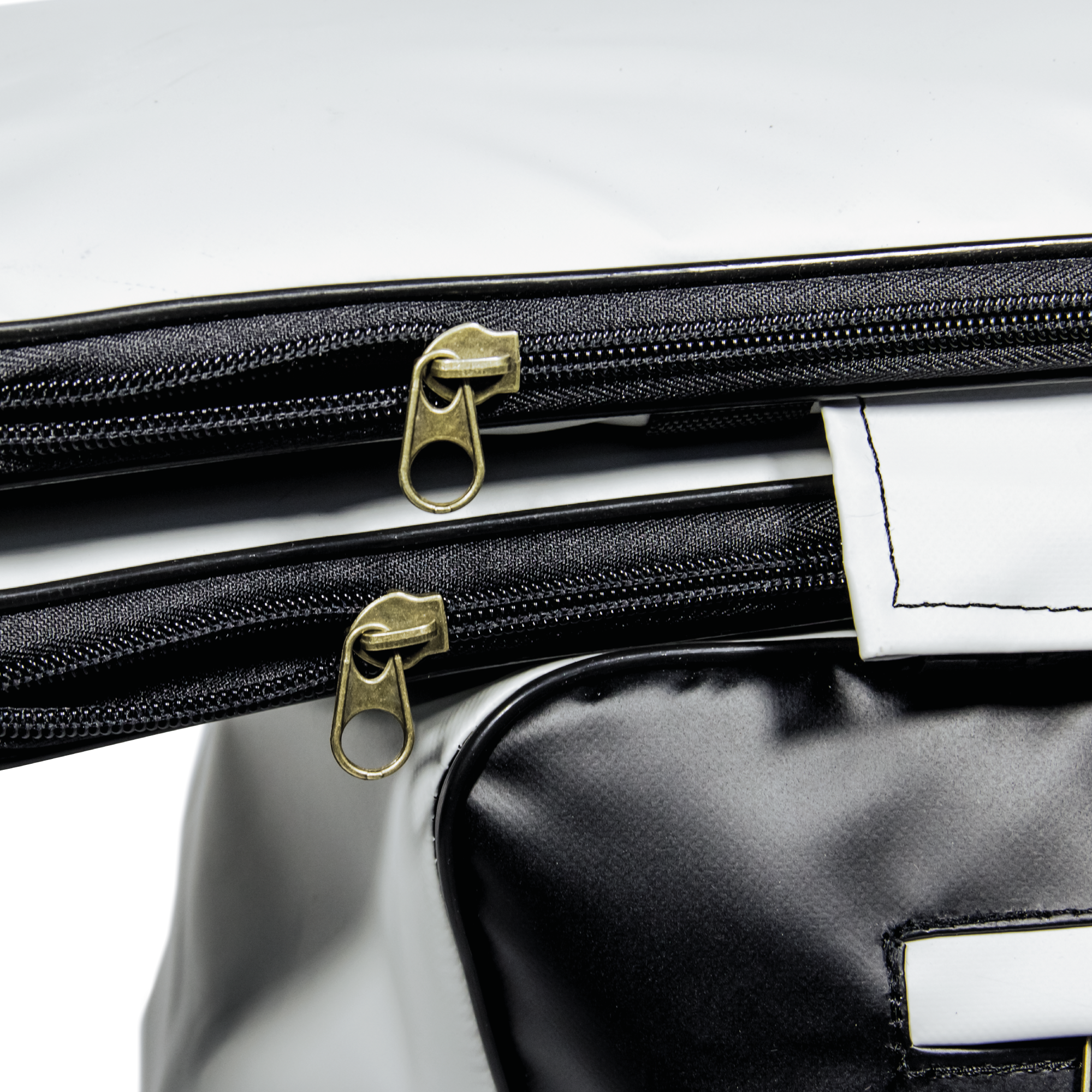 Ткань ПВХ светлого цвета с черной каймой.