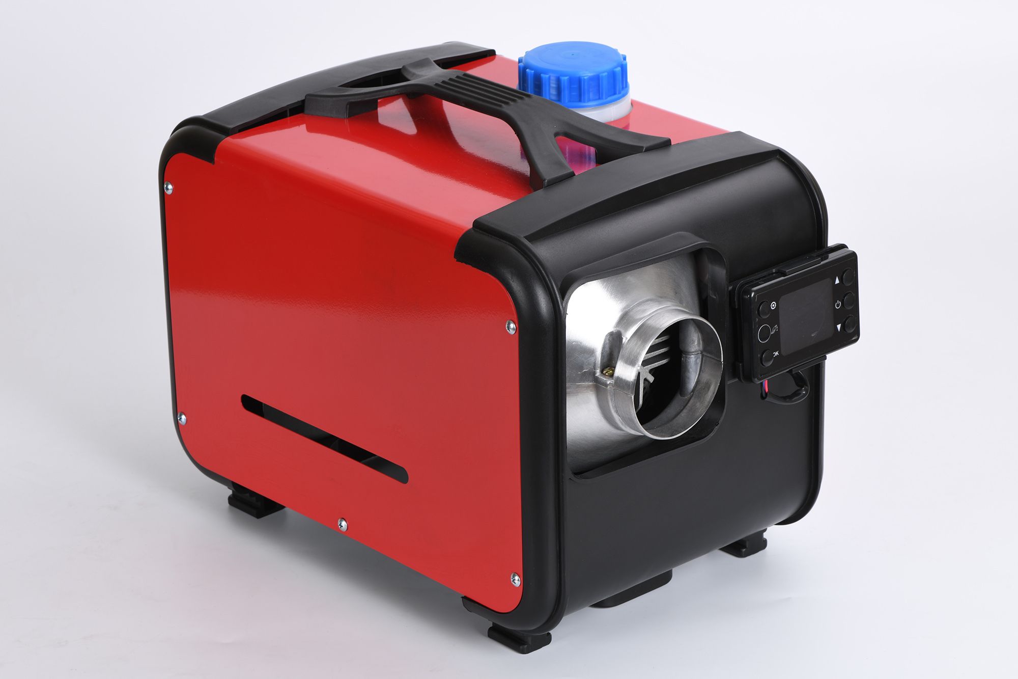 Мощность обогревателя регулируется до 5КВт, в комплекте многофункциональный пульт управления с возможностью выбора мощности на постоянной основе или же установки климат-контроля по температуре для поддержания заданной температуры внутри помещения, а также выводит информацию по напряжению аккумулятора, имеет функцию предварительной прокачки топлива перед первым запуском, а также автоматический запуск. В комплекте так же имеет пульт дистанционного управления с дальностью действия 50-70 метров. Максимальная температура нагретого воздуха на выходе ≈ 100°C. Отопитель работает на дизельном топливе и питается от 12 или 24 или 220 вольт.