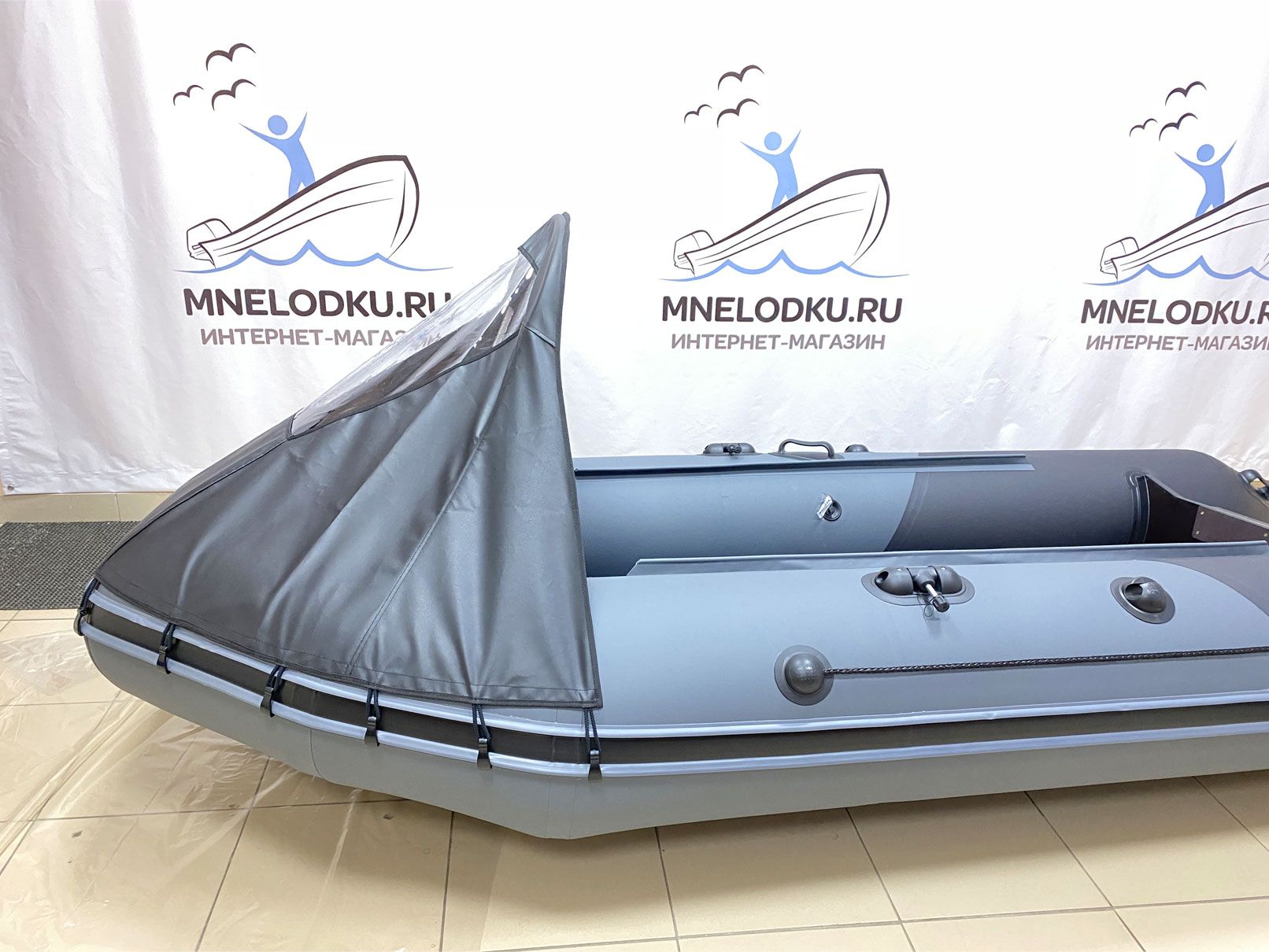 Тент носовой с окном на надувную лодку ПВХ предназначен для защиты от брызг и ветра пассажиров лодки. Изготовлен из ткани ПВХ, окно их прозрачного ПВХ. Имеет разборную каркасную дугу из дюралюминиевой трубы диаметром 16 мм со штекерной системой сборки. Тент устанавливается на борта лодки при помощи шайб на концах каркасной дуги и закрепляется на привальном брусе при помощи крючков.